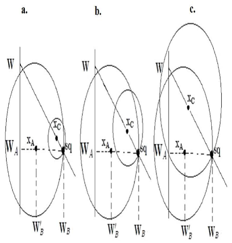 Figures 2a, 2b and 2c are three possible political configurations in which the positions of the ideal point of the mayor and the status quo do not change. In consequence, if the mayor’s ideal point xA and the status quosq are parameters in the model, then for each ideal point xC of the council in the interval [ e2W, sq] there is a political configuration. Therefore, there are as many political configurations as ideal points xC in interval [ e2W, sq].