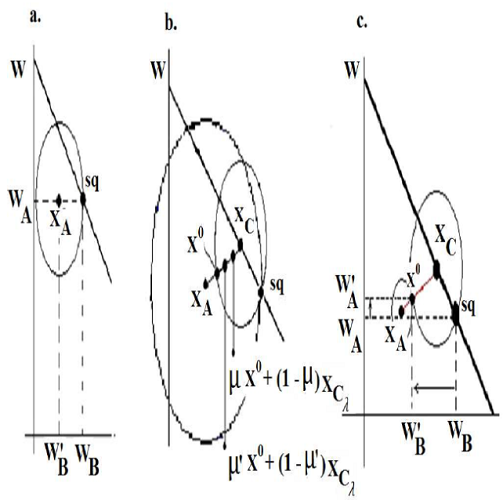 The aforementioned is known by the mayor, so that he will seek, during the period in which he governs, to worsen the living conditions of worse-off individuals by executing an inadequate and inefficient investment in public policies that benefit them. This will enable him to negotiate the votes at a lower price in the next electoral campaign, since a reduction in the endowments of wealth of worse-off individuals, ceteris paribus, will induce in them lower valuations of their votes. Therefore, the ideal point xA of the mayor, as an expression of their system of ends, is located in segment [(0, WA ), sq] such that the wealth endowments of social group VA don’t change (see Figures 2a, 2b and 2c).