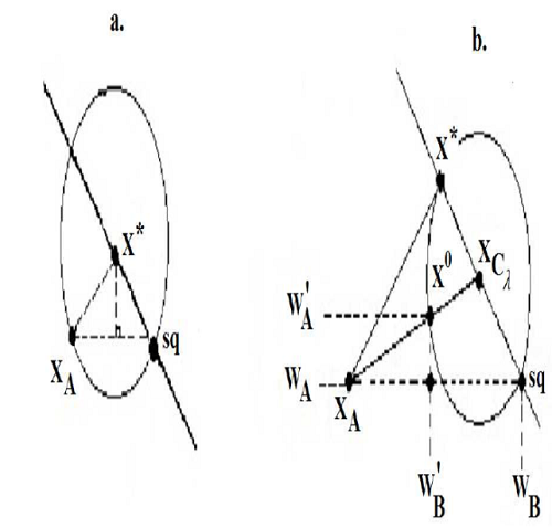 Let x* be an allocation rule situated on segment [ e2W, sq] such that ∥ x* − sq∥ = ∥ x* − xA ∥ ( Figure 5a). That is, x* is an allocation rule with respect to which the council is indifferent between the status quosq and the mayor’s ideal point xA . Let C( V, u, W) = {(, xA , sq) : = λ x* +(1−λ) sq and λ ∈ [0,1]} be a subset of political configurations in which xA and sq are fixed, and in addition it holds that is a convex combination of x*and sq, and therefore, the position of ideal point depends on the value of λ in the closed interval [0, 1].