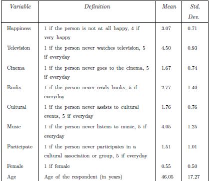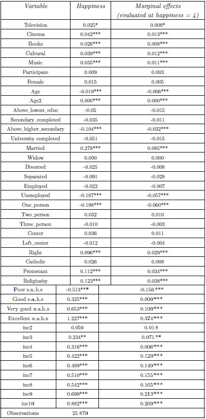 Our results lead us to conclude that well-being, measured as self-reported happiness, has many determinants, which range from gender to income and political affiliation, and that these determinants vary greatly in the degree to which they impact happiness. In regards to culture and happiness, attending cultural activities or consuming leisure (such as watching television or reading books) has a significant impact in the levels of reported happiness, which is in line with the research of Stiglitz, Sen and Fitoussi (2009).