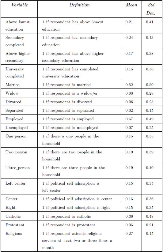 Ordered response models are the standard way of modeling subjective well-being estimations. In such models, individuals make an evaluation of their utility and classify it under one of the categories at their disposition. Results using ordered models have been proved to be close to the results derived from OLS regressions when the dependent variable range over a large scale, which is not our case, since we have only four values. For our study, we therefore favor ordered response models (for an overview of methods and implications, see Ferrer-i-Carbonell and Frijters, 2004).