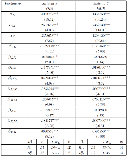 El Cuadro 4 presenta los resultados de la estimación de los sistemas de Ecuaciones (3) y (6). El sistema (3) se estimó ecuación por ecuación con la aplicanción de OLS. Hay que observar que, como se hizo notar en la sección de metodología, se cumplen las condiciones adding up descritas en la expresión (4), dado que la suma de las participaciones de costos es uno para cada observación (SL + SK + SM = 1).