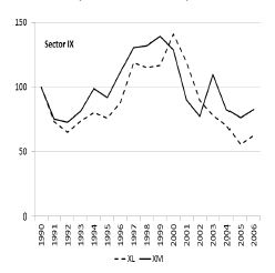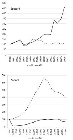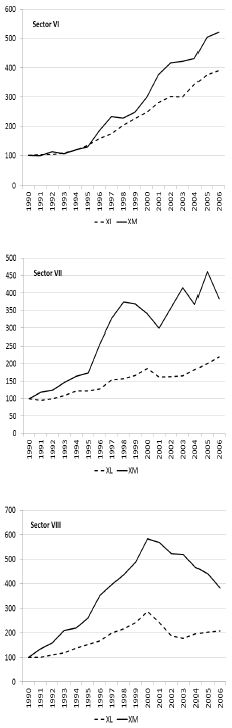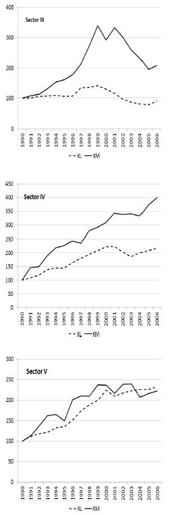 Se puede apreciar que, en efecto, en casi todos los sectores económicos -excepción hecha de los sectores I (Selección, preparación, empaque y enlatado de alimentos), II (Ensamble de prendas de vestir y otros productos confeccionados con textiles y otros materiales) y III (Fabricación de calzado e industria del cuero)- se manifiesta una clara relación directa entre los índices de mano de obra y materiales.7 Esta evolución puede ser consecuencia no solo del comportamiento de los precios de los factores, sino de otros factores subyacentes a cada sector maquilador que, es importante anotar, no hemos incorporado en este análisis.