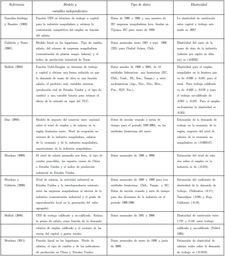 Estudios previos sobre la industria maquiladora han abordado los determinantes económicos del crecimiento en la industria (González-Aréchiga y Ramírez, 1989); la influencia en el empleo de las economías de aglomeración derivadas de la especialización y concentración industrial (Mendoza y Calderón, 2000); los incentivos de las plantas maquiladoras para instalarse en la zona fronteriza norte (Calderón y Ponce, 2001); el efecto del TLC en la demanda de mano de obra (Díaz, 2005; Mollick, 2003); el impacto de la actividad industrial de EUN y China en el empleo maquilador (Mendoza, 2009, 2011); la influencia del tipo de cambio en la elasticidad de la demanda con respecto al salario (Mollick, 2009) y los determinantes de la prima del salario de la mano de obra calificada en la industria maquiladora (Mollick, 2008; Mollick e Ibarra, 2013).