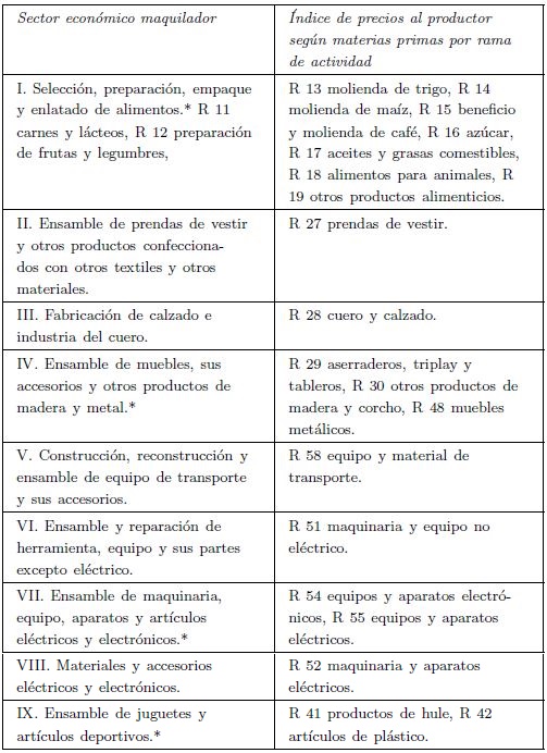 El índice de cantidad para materiales , se calculó mediante la razón de gasto en materiales por el índice de precios al productor de materias primas,4 en relación con cada sector económico y rama de actividad. Específicamente, donde es el índice de precios de materias primas del sector r en el año t. El índice de materiales con base 1990 se obtiene de la siguiente forma: El Cuadro 2 muestra los índices de precios que se utilizaron en cada sector económico.