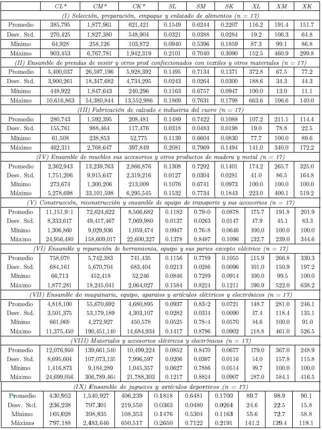El Cuadro 3 muestra estadísticas descriptivas de las variables descritas en esta sección. A partir de la estadística descriptiva por sector económico se desprenden algunas características generales de la industria maquiladora: