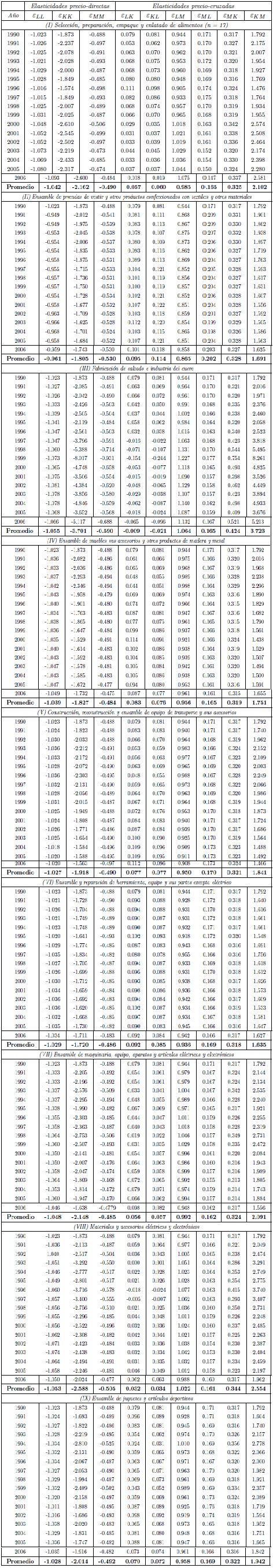 Las elasticidades precio - cruzadas son en su mayoría positivas, excepto en los casos de los sectores III (Fabricación de calzado e industria del cuero) y VIII (Materiales y accesorios eléctricos y electrónicos) en relación con las elasticidades precio cruzadas de la mano de obra con respecto al precio del capital (εLK ) y del capital con respecto al precio de la mano de obra (εKL). En el sector III esas elasticidades fueron negativas de 1997 a 2006 y como resultado los promedios anuales fueron negativos: εLK = -0.009 y εKL = 0.021. Para el sector VIII se obtuvieron elasticidades precio cruzadas trabajo-capital negativas en 1996 y 1997, aunque los promedios anuales en este caso fueron positivos: εLK = 0.032 y εKL = 0.034.