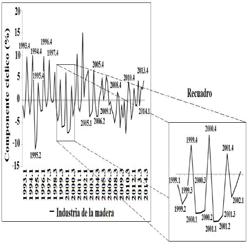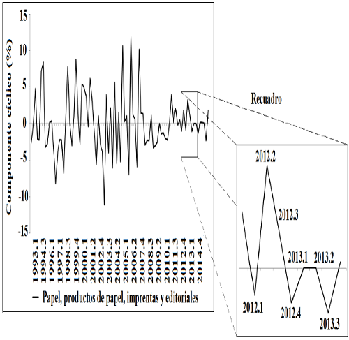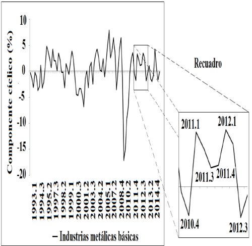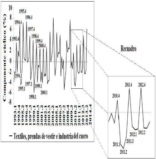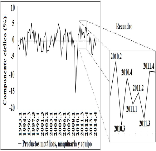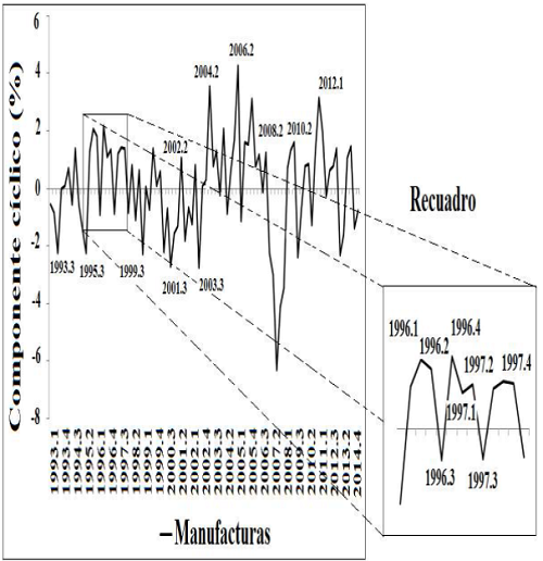 Antes de comentar los resultados con las pruebas formales es conveniente analizar, de forma exploratoria, la evolución y el comportamiento del ciclo de la productividad de las manufacturas y sus nueve sectores. En las Gráfica 1, 2, 3, 4, 5, 6, 7, 8, 9 y 10 se dibujan las trayectorias del ciclo económico durante 1993-2014. En cada caso se destaca, en forma de recuadro, una parte del ciclo formado por las actividades industriales.