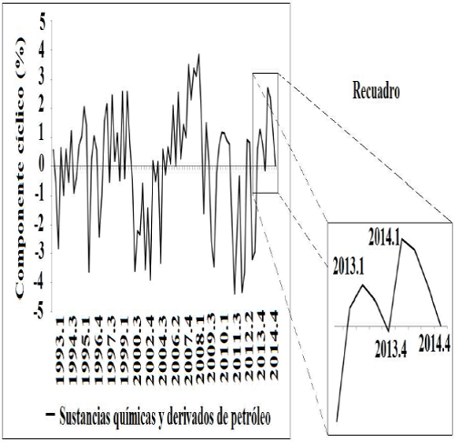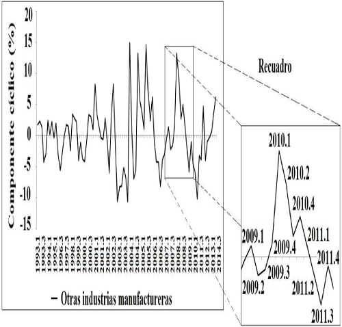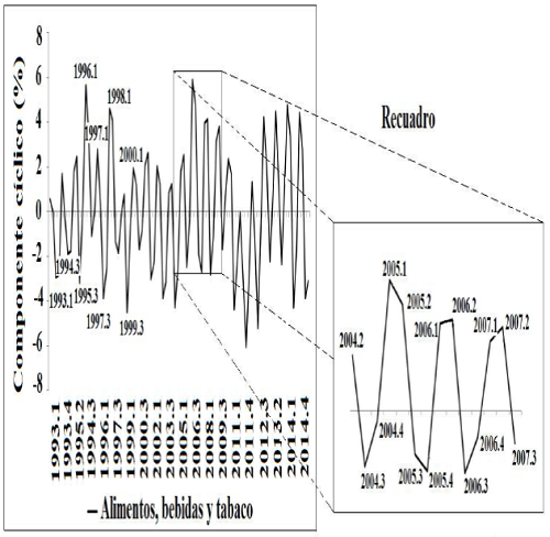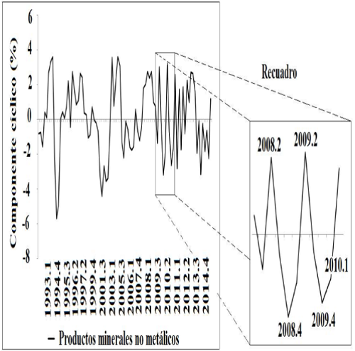 En general, se identifican ciertos patrones cíclicos en los que no en pocas ocasiones los trimestre 1 y 4 sobresalen en la parte superior o inferior del ciclo. Esta apreciación visual, aunque no es uniforme en todos los sectores, constituye una primera aproximación a la relación que probablemente describen los ciclos económico y político. La Gráfica del recuadro, que muestra con mayor detalle una parte de la trayectoria, permite visualizar el comportamiento típico de un ciclo, lo que da certidumbre sobre la técnica de filtración usada para separar el ciclo de los demás componentes.
