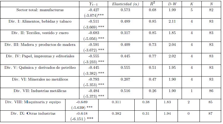 Resultados desde la Ecuación (2) se reportan en los Cuadros 2, 3 y 4. En el Cuadro 2 se presentan los coeficientes estimados que hacen estacionaria la serie, así como la elasticidad de la productividad para el total de las manufacturas y sus nueve divisiones desde un horizonte global y de largo plazo.