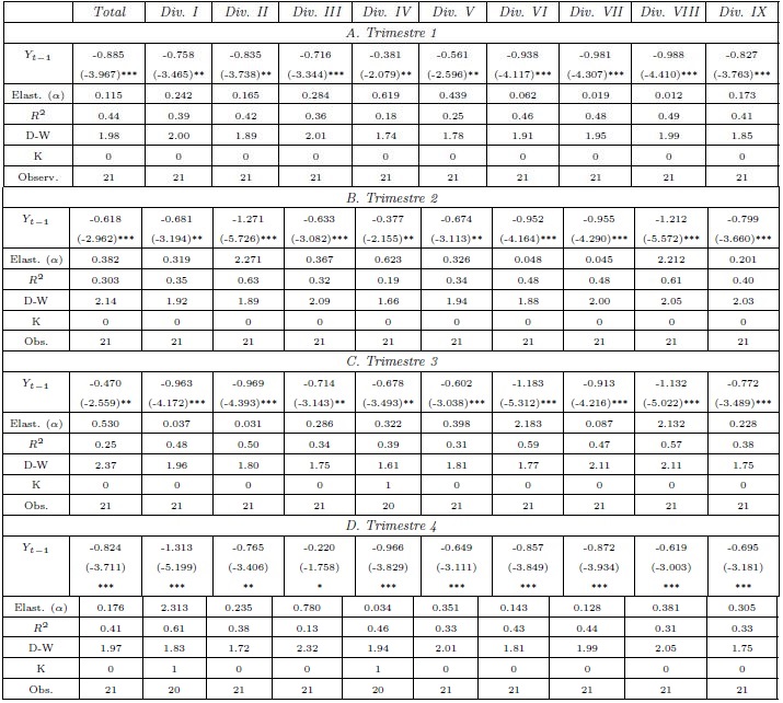 En el Cuadro 3 se reportan los resultados desde una perspectiva trimestral, es decir, para cada sector de la actividad económica se toma la serie de valores de igual trimestre y se le aplica la prueba de estacionariedad. De esta manera, el tamaño de la elasticidad y las diferencias estimadas entre los periodos temporales son indicativos de que existen procesos de desaceleración y crecimiento de las actividades económicas muy diferentes entre cada tipo de trimestre, aunque también entre cada sector industrial. Por ejemplo, en la serie de manufacturas total se estiman elasticidades muy bajas para los trimestres 1 y 4. Sin embargo, es evidente que esta conducta no tiene por qué ser la misma en cada división industrial, ya que también se trata de sectores con dinámicas desiguales.