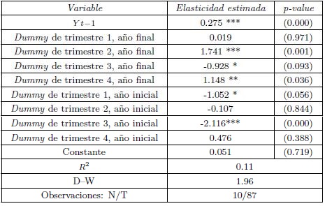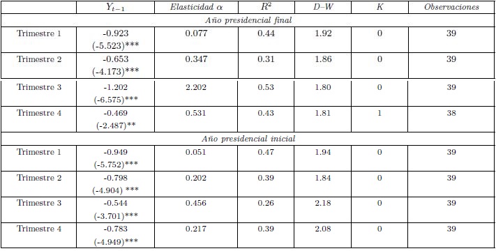 Adicionalmente, la evidencia sobre las diferencias entre los tiempos electorales (último y primer año) y no electorales puede apoyarse mediante un modelo de panel dinámico con intercepto diferencial de trimestre. La idea es ver si alguno de los trimestres de los años con cambio de gobierno es significativamente diferente del resto de periodos, lo que produce evidencia adicional del ciclo político-económico.