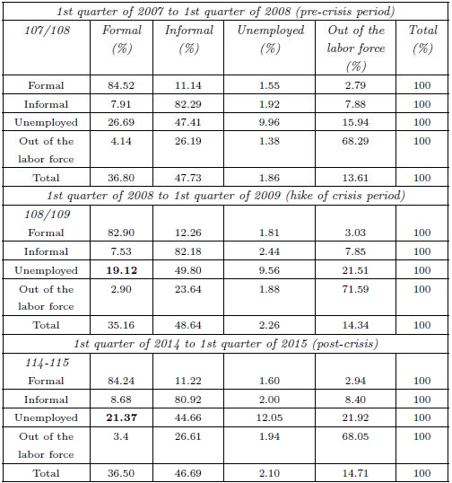 Finally, Table 2 shows workers’ mobility in the labor market, and how their mobility has changed between 2007 and 2014. In general, mobility decreased during this period, that is, in 2014 a higher proportion of individuals remained in the same status in the labor market. Although fortunate for the employed, the unemployed are striving to find a job. In 2007, before the financial crisis, 9.96 percent of the unemployed remained in that position after five quarters, whereas 74.10 percent of them found a job, 26.69 percent in the formal market and 47.41 percent in the informal market. In contrast, at the beginning of the 2008 crisis the proportion of individuals who were still unemployed amounted to 9.56 percent, but the percentage of those who had found a job decreased to 68.92, the formal market having registered the greatest decrease. Currently, in the 2014 post-crisis period, an even smaller proportion of the unemployed found a job, namely 66.03 percent, mainly due to a hiring decline in the informal market -44.66 percent versus 49.80 percent in 2008-, and secondly due to an increase in people who remained unemployed -12.05 percent vs. 9.56 percent. Moreover, most workers who were already out of the labor force remained in that category and nearly all of those who did manage to enter the labor market found a job in the informal sector.