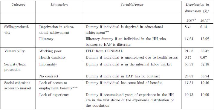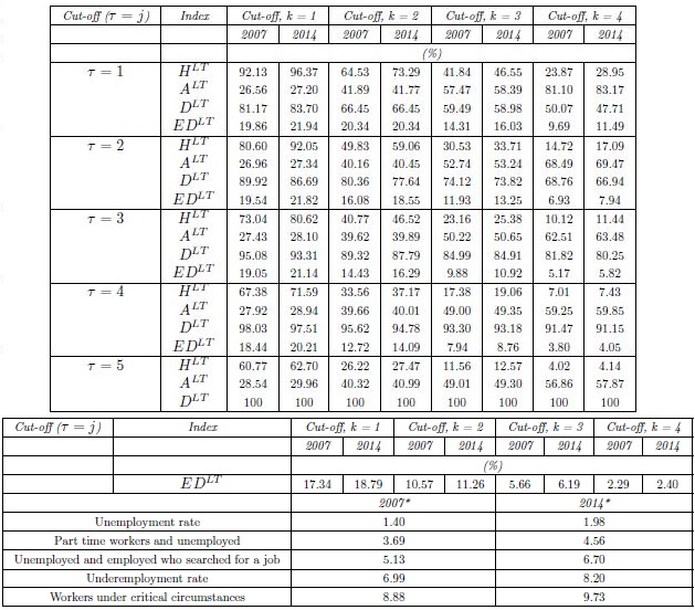 The structure of the paper is as follows. In section 1 we define the long-term deprivation index in which we identify the long-term deprived and the aggregation of individuals in an overall index. Section 2 discusses the labor market situation in Mexico during the 2007-2014 period of analysis. In section 3 we explains the attributes considered in the analysis, the results and their relation with important labor market employment indicators. Finally, section 5 presents the conclusion.
