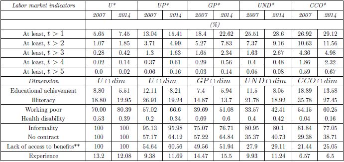 In the first three rows we report the percentage of individuals that fell under the labor market indicator reference at least t times. For example, for unemployment (U) in 2007, 5.65% of the individuals were unemployed in at least one quarter. This percentage drops when considering individuals who were unemployed durng two quarters, and it is minimal when t = 5. We observe that the 2014 percentages are higher in every category and also that, although the rates of unemployment are low, 29% of workers labored at least one period in conditions considered critical. In line with Joutard and Sagaon (2006), we observe that unemployment in Mexico shows very short durations, which is also the case for the rest of the labor indicators. In this sense, the heads of household seem to be mobile, but many of them fell at one point in time into conditions of labor vulnerability.
