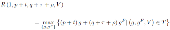 (1)where p and q are the international prices for the non-numeraire and the intermediate input, while g and gF are the gross supply of the non-numeraire and the intermediate input (F stands for the intermediate input for the rest of the paper), V is the aggregate vector of net inputs, x the vector of total net outputs of goods while T stands for convex technology.9