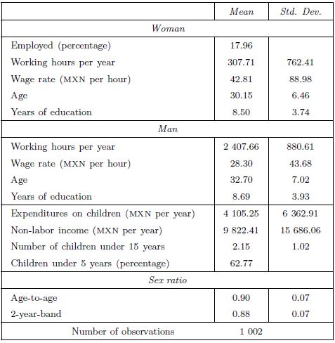 Table 1 reports descriptive statistics of the final sample. The low female participation rate - only 18 percent of the women (180 of 1 002) participate in the labor market - represents a challenge to the model estimation since the procedure for imputing potential wages to all women in the sample is based on the information from working women. The mean annual number of working hours is 308 for all women in the sample and 2 408 for men. However, working women have on average a higher hourly wage rate than men (MXN $43 versus $29). Using the procedure described in subsection 4.3.1., the female’s log wage rate and the interaction between the couple’s log wage rates are replaced for all observations by their fitted values (see Appendix 1, Table A3.1). There is no significant difference in years of education (approximately eight years), while women are on average two-and-a-half years younger than their husbands.