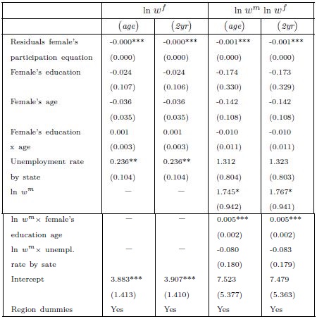 The wage equations are identified from the exclusion of house-hold non-labor income, the distribution factor, the male partner’s age and education, a second-order polynomial in the number of children in the household under 15, and a dummy variable for the number of children under five. To identify the effect of the womans log wage rate and the cross product of log wages on the woman’s labor supply, it is necessary that Xtwf and Xtwfwm each contain at least one variable not in Xtf and XtK . The chosen variables for XtK are the cross product of the woman’s age and education (see, e.g. Mroz, 1987), and the unemployment rate by state and by year-quarter of the first survey visit to the household as a means of accounting for local labor market conditions. For Xtwfwm , the male partner’s log wage, the same variables considered for Xtf , and the interaction between them are chosen. The choice of instruments is based on Wooldridge (2010)’s discussion of identification in simultaneous equations models that are nonlinear in endogenous variables, particularly models with interactions between exogenous variables (here, ln wtm) and endogenous variables (here, ln wtf ).