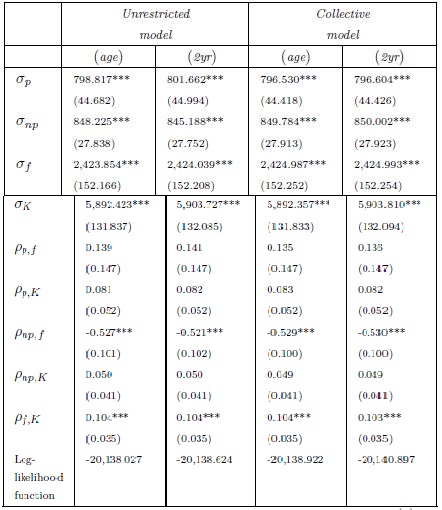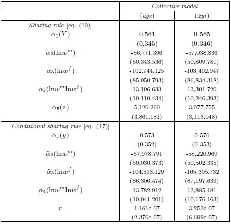 Using the log-likelihood values for each model it is possible to construct LR statistics to test the collective restrictions (18)-(19). In the version employing the age-to-age (2-year-band) sex ratio the test statistic of 1.79 (4.55) is smaller than the critical value of χ20.05 = 5.99. Hence, for both sex ratios, the collective model cannot be rejected, a finding that is consistent with the hypothesis that the presence of children in a household generates non-separabilities in individual consumption. Others that have not explicitly considered this aspect have usually rejected the collective rationality when analyzing a household with children (see Fortin and Lacroix, 1997; Donni, 2007).