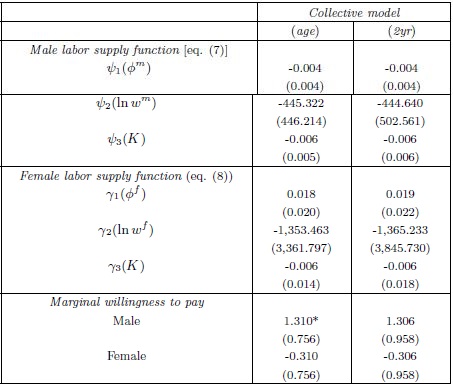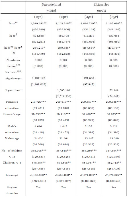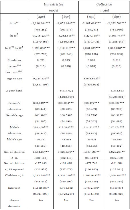Tables 2, 3 and 4 and Appendix 1, Table A4.1 show the parameter estimates of the unrestricted model (24)-(25), which assumes that the male’s labor supply function is continuous along the female’s participation frontier, and the associated collective version, which imposes the restrictions (18)-(19) in the estimation process. Two versions are estimated, one using the age-to-age sex ratio variable as a distribution factor (columns labeled (age)), and the other using the 2-year-band sex ratio variable (columns labeled (2yr)).