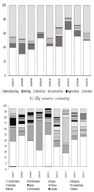 This section describes our two main variables of interest: FDI and uncertainty. From 2007 to 2015, the Mexican manufacturing sector, which on average accounted for 16.6 percent of GDP during this period, attracted an annual average of 46.2 percent of total FDI flows.8 In contrast, the services sector, which on average accounted for 59.7 percent of GDP in this same period, attracted an annual average of 38.7 percent of total FDI flows (Secretaría de Economía, 2017). The United States was responsible for most of the FDI flows into the Mexican manufacturing sector, except for two years: in 2010, the Dutch company Heineken bought the brewery FEMSA (FEMSA, 2017), and in 2013 the Belgian company Anheuser-Busch InBev acquired another brewery, Modelo (Anheuser-Busch InBev, 2017). See Figures 1a and 1b for more details.