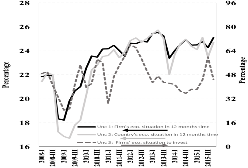 The answers to this question can only be “good moment”; “bad moment or “I am not sure”, so the uncertainty measure, which varies across time but not across subsectors, is built with the percentage of forecasters that answered “I am not sure”. This variable is available from I/2007 to IV/2015 and we will refer to it from now on as unc3: Firms’ eco. situation to invest. Figure 2 shows the evolution of these three uncertainty