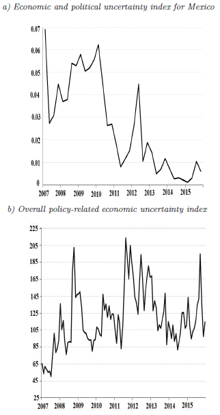 Economic and Political Uncertainty Index for Mexico: This uncertainty proxy is built by Banco de México as the ratio of news found in Bloomberg containing the words “Mexico”, “uncertainty”, “economy” and “politics”, or “México”, “incertidumbre”, “economía” and “política” to the news found in this same source related to other topics.