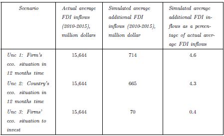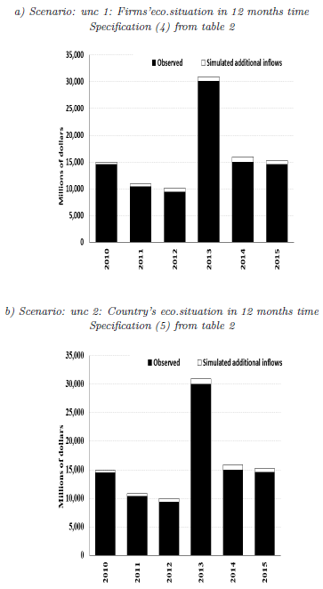 Finally, in order to assess the size of the negative effect of uncertainty on FDI flows into the Mexican manufacturing sector, we perform some simulations under the assumption that uncertainty for each and every quarter during the period 2010-2015 is equal to its registered level minus 1 percentage point. The results indicate that if uncertainty (proxied, as an example, by unc1: Firm’s eco situation in 12 months time) for each and every quarter during the period 2010-2015 had been lowered by 1 percentage point, then the Mexican manufacturing sector would have received, on average, an additional 714 million dollars FDI flows (or an additional 4.6 percent of actual average FDI inflows) per year over the 2010-2015 period. The findings are relevant for any policymaker since they suggest that a stable macroeconomic environment should be maintained in a country in order to attract FDI flows and, therefore, promote economic growth.