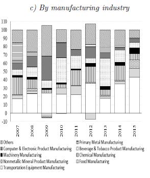 FDI flows into the Mexican manufacturing sector have been heterogeneous. In 2007, most FDI flows went into the primarymetal manufacturing sector, followed by the chemical manufacturing sector and the transportation-equipment manufacturing sector. In 2010 and 2013, the beverages and tobacco-product manufacturing sector was the biggest recipient of FDI flows, as mentioned above. However, in 2012 and 2015 the transportation-equipment manufacturing sector attracted 35.7 percent and 42.8 percent of the FDI flows, respectively. See Figure 1c.