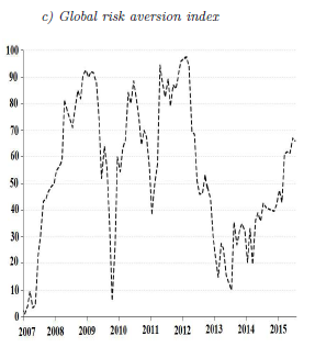 Global Risk Aversion Index: UBS publishes this index, which represents the historic percentile of a risk aversion coefficient γ of an investors utility function, who chooses how much of his/her resources to invest and/or to consume today. This γ is estimated by considering monthly returns on the MSCI Developed Markets Index and changes on the composite Developed Markets Purchasing Managers’ Index to proxy for demand swings.
