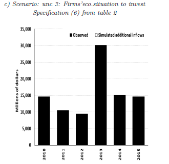 In other words, we build a counterfactual scenario for the FDI flows going into the Mexican manufacturing sector during the period I/2010 - IV/2015 by assuming that uncertainty for each and every quarter during the period I/2010 - IV/2015 is equal to its registered level in that period minus 1 percentage point. We then compare the counterfactual scenario with a base scenario in which the uncertainty variable takes its registered values, and the difference between both scenarios is finally attributed to the change in uncertainty.