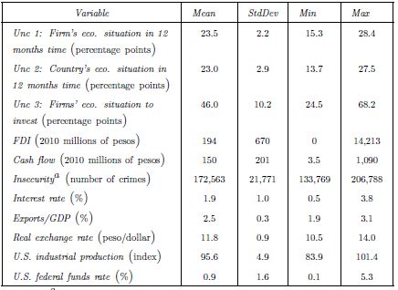 All the variables in the model are expressed in logarithms, except for the uncertainty variables, the interest rate on Mexico’s inflation indexed bonds, the exports to GDP ratio, and the U.S. federal funds rate, which are expressed in percentages.14Table 1 presents some summary statistics on the variables described above.
