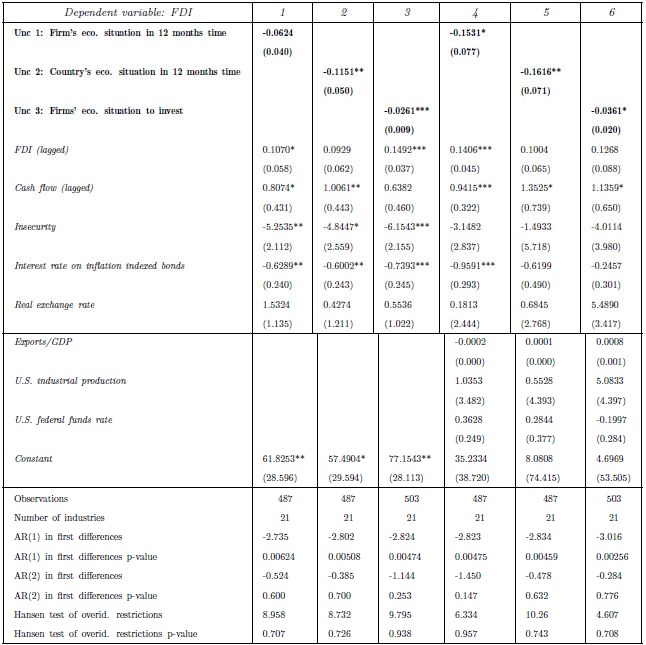 The rest of the domestic and external variables included in the model do not have a statistically significant effect on FDI flows. It seems that cash flow and uncertainty, which are more directly related to the microeconomic behavior of the manufacturing subsectors, are having all the impact on FDI flows.