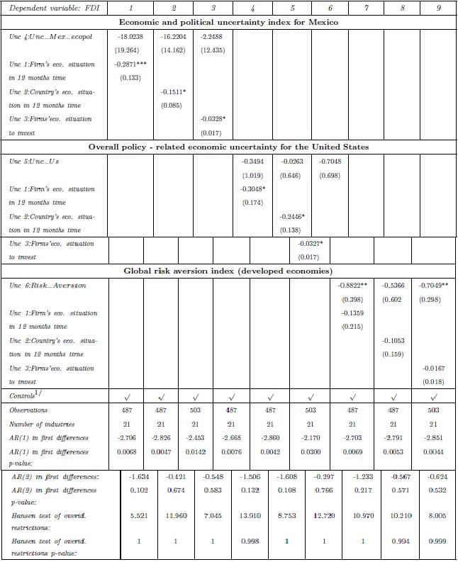 Overall, the results suggest that the idiosyncratic uncertainty measures seem to be more important in explaining FDI flows into the Mexican manufacturing sector than aggregate uncertainty measures which affect all manufacturing subsectors in general. Nonetheless, the aggregate uncertainty measure capturing global risk aversion seems to have an effect on FDI flows as well.