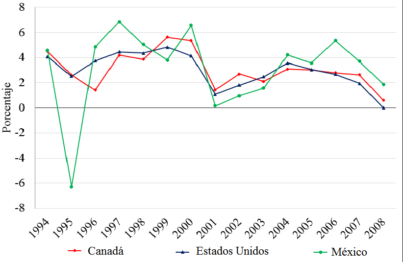 A su vez, el producto por habitante en estos países alcanzó, en promedio para ese mismo periodo, 21 394 dólares en Canadá, 34 565 en Estados Unidos y 7 099 dólares para México. La economía de Estados Unidos es, en efecto, siete veces mayor que la de sus socios comerciales juntos. Por otra parte, la población mexicana (103 millones de habitantes en promedio anual) supera con creces a la canadiense (31 millones), la que goza de niveles de bienestar superiores. De igual manera, el producto norteamericano combinado para los tres países alcanza un valor de 11 216 039 millones de dólares y para una población combinada de 417 millones de personas resulta en un PIB por habitante de 26 786 dólares (promedio anual para el periodo 1993-2008).