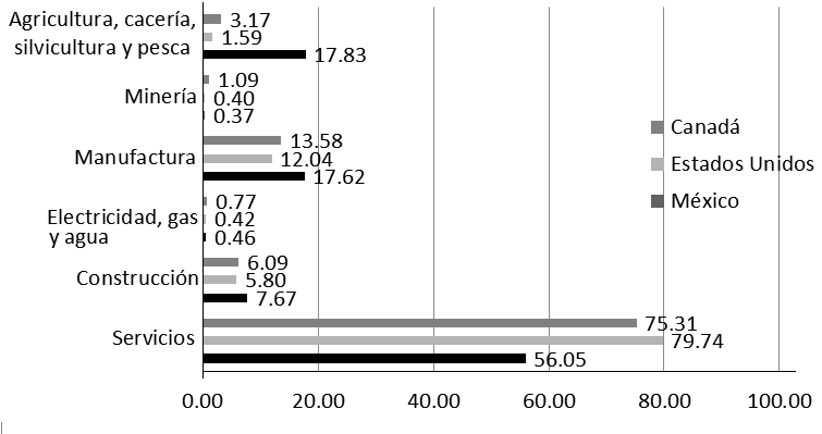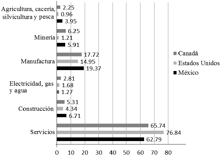 Las economías norteamericanas son principalmente productoras de servicios, como se aprecia en la Gráfica 2, aunque este sector es ligeramente mayor en Estados Unidos, Canadá es un país relativamente más orientado a la producción de bienes primarios, en particular mineros y de electricidad, en México las manufacturas y la agricultura son mayores como proporción del PIB. En Canadá la construcción y los servicios son los sectores de mayor crecimiento promedio anual durante el periodo (3.9 y 4.2%, respectivamente), en Estados Unidos la agricultura y la manufactura con tasas de (3.7 y 3.5%) y en México la electricidad y los servicios son los sectores de mayor crecimiento (4.0% y 3.3%).