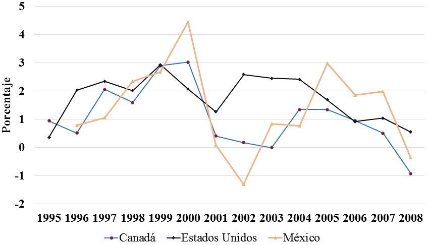 La Gráfica 1 muestra el crecimiento de las economías en el periodo. En promedio, cada una de las tres economías alcanza una tasa promedio anual de expansión aproximada de 3%. El PIB total en cada país en 2008 fue alrededor de 1.6 el registrado en 1993. Sin embargo, como se aprecia en la gráfica, México muestra un comportamiento relativamente más inestable, asimismo, el ritmo de crecimiento de las tres converge hacia tasas menores7 y -como ya se ha señalado- el ciclo económico también converge hacia el determinado por Estados Unidos (Cuevas, 2012). Por su parte, el producto por habitante crece en cada país a tasas promedio anual de: 2.1% para Canadá, 1.9% para Estados Unidos y 1.5% para México, donde la población aún crece de forma acelerada. Para América del Norte la tasa anual de crecimiento del producto por habitante es de 1.8%, donde -salvo un estudio específico- la variable no parece converger entre los países.