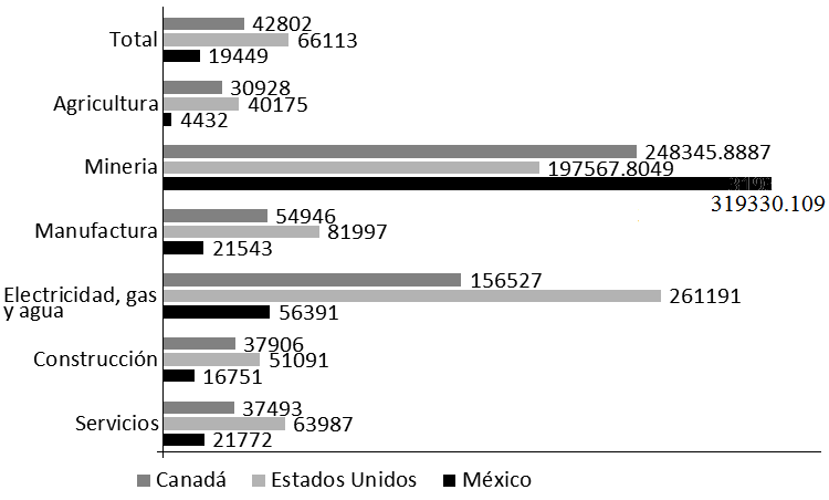 El producto por trabajador crece más rápidamente en la agricultura en los tres países (3.9% en Canadá, 4.4% en Estados Unidos y 4.7% en México), por otro lado, en la manufactura el producto por empleado en Estados Unidos crece a una tasa de 5% promedio anual. Esta variable presenta una tasa decreciente en la minería canadiense (2% anual),9 donde, de acuerdo con la Gráfica 5, es el sector en el que el producto por empleado es mayor en ese país (252 081 dólares) y es menor en la construcción (38 625 dólares). En el sector de electricidad, gas y agua de Estados Unidos el producto por empleado alcanza 277 302 dólares, donde la relación es más alta, mientras que la relación es menor en la construcción, con 50 000 dólares anuales, en promedio. Por último, en México la relación es mayor en la minería (319 330 dólares) y menor en la agricultura (4 432 dólares). En los tres países esta relación producto por empleado sectorial es notablemente desigual, pero en México la productividad del empleo en la minería es 72 veces la de la agricultura; en Canadá la relación entre el sector más productivo y el menos es de siete veces y en Estados Unidos de ocho. Conviene destacar que el sector más productivo en América del Norte es la minería mexicana, con escaso impacto en los totales del producto, del empleo y del producto por empleado, dado el tamaño sectorial relativo al total nacional, además de que usa una tecnología que demanda proporciones bajas de empleo y altas de capital.