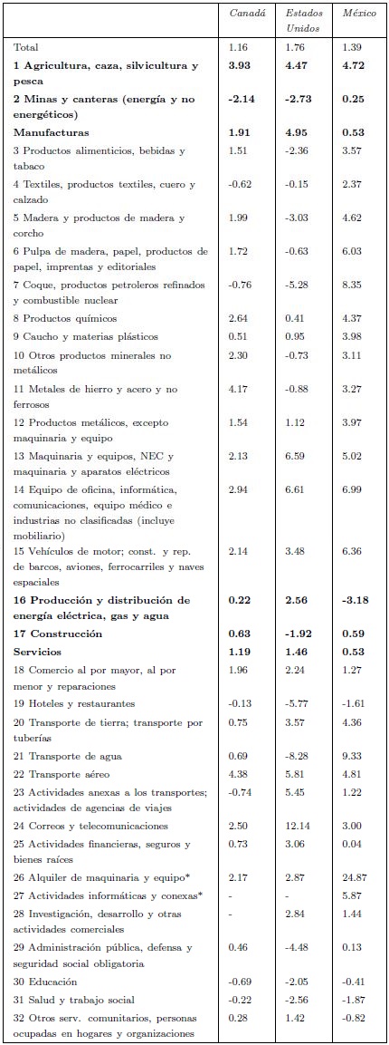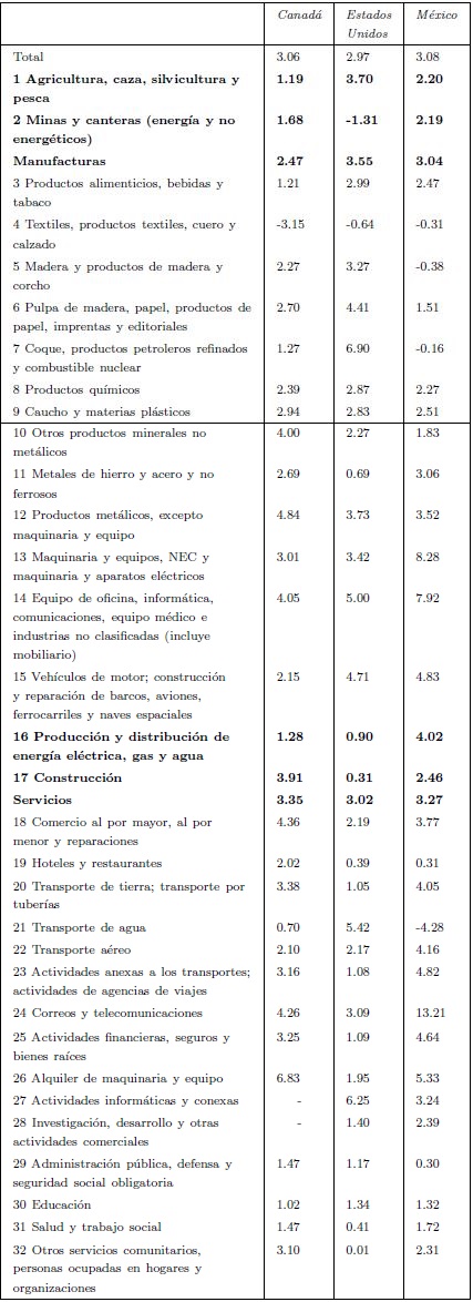 La productividad factorial mantiene un comportamiento distinto en las diversas ramas en cada país, por lo que permanece distinta, en particular en México frente a sus socios, el cual emplea mayores cantidades de capital y de trabajo por unidad de producto, de manera que su productividad es menor. Canadá por su parte emplea menores cantidades de factores trabajo y capital por unidad de producto, pero el crecimiento de la productividad es mayor en Estados Unidos.