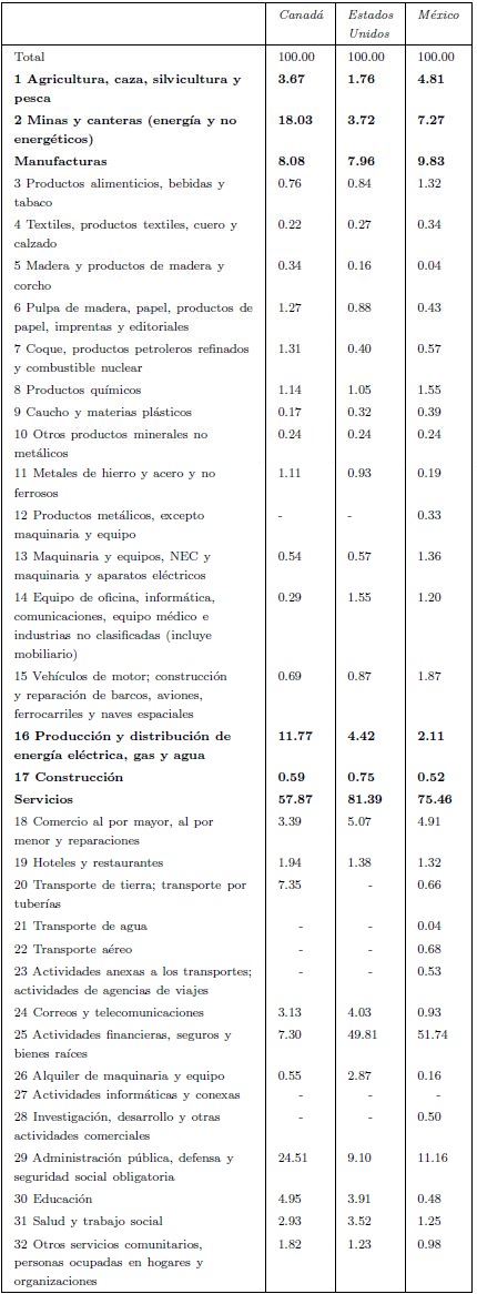 Ahora bien, estos últimos resultados obedecen a tres componentes, el primero, los coeficientes de insumos no producidos y consumidos en cada economía por unidad de producto, del que ya se discutió. El segundo componente es la complejidad de la economía, en efecto, en una economía más compleja, donde los intercambios entre ramas son más intensos la producción en cada SVI requiere mayores cantidades de insumos indirectamente, a la vez que se potencia el empleo directo e indirecto de cada unidad de insumo. En una economía más compleja, los índices productivos serán mayores relativamente, como ocurre con los resultados de Estados Unidos frente Canadá, aun cuando, por ejemplo, los coeficientes de trabajo directo promedio son comparables. El tercer componente es el conjunto de relaciones intersectoriales existente en América del Norte. Los resultados presentados en esta sección se han calculado sobre una Tabla trinacional de intercambios por rama de origen y destino. Por ello, los resultados para cualquier rama, en cada país, toman en cuenta las relaciones establecidas entre las tres estructuras productivas.