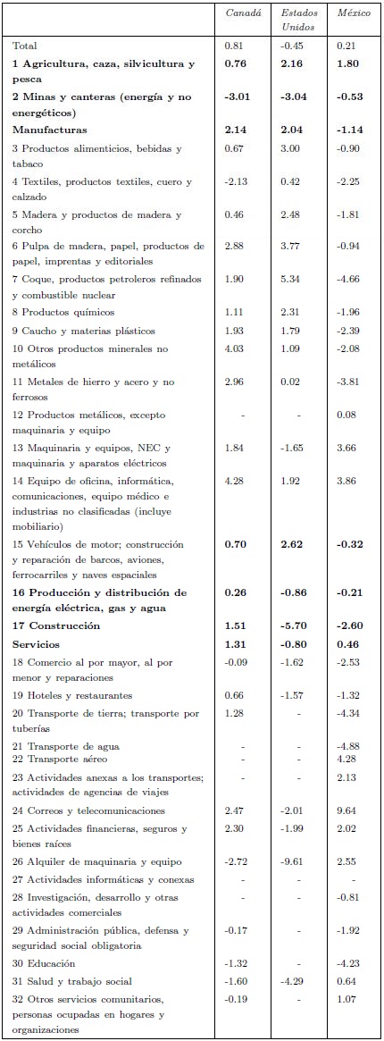 Los coeficientes de variación correspondientes al crecimiento del empleo y del producto por empleado (ver Cuadro 2) para Canadá son reducidos, acusan un comportamiento más homogéneo entre las ramas (2.7 y 2.5, respectivamente), incluso si algunas presentan tasa de crecimiento negativas y otras positivas. Para México estos coeficientes son 4.2 y 18.3: el empleo crece más uniformemente en las distintas ramas, no así el producto por empleado. En Estados Unidos ambos coeficientes son altos: 13.1 y 24.2, respectivamente. Para el caso de México, la rama de correo y telecomunicaciones presenta una tasa de crecimiento promedio de 12% y cinco ramas de diversa naturaleza tienen tasas de crecimiento altas, mientras trece ramas muestran tasas de crecimiento negativas y, entre éstas, las variaciones son significativas. Para Estados Unidos la rama de alquiler de maquinaria y equipo observa una tasa muy alta y hay cinco ramas con tasas altas, es decir, también en este país el crecimiento de la productividad se distribuye desigualmente.