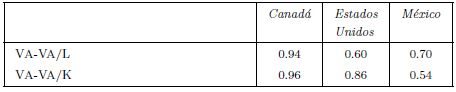 Para concluir esta sección, el Cuadro 5 presenta los coeficientes de correlación entre las tasas de crecimiento del VA y la del VA por empleado, así como entre el crecimiento del VA y del crecimiento del VA relativo al crecimiento de los acervos de capital en cada país. En Canadá el comportamiento de la productividad de los factores y el crecimiento del VA observan una tendencia similar, en Estados Unidos la productividad del capital sigue más de cerca al VA, al contrario de México, donde la conducta de la productividad laboral está más cerca del VA. No obstante, en este país, las correlaciones son menores que en el resto. En Canadá por el contrario, las trayectorias de las variables son iguales.