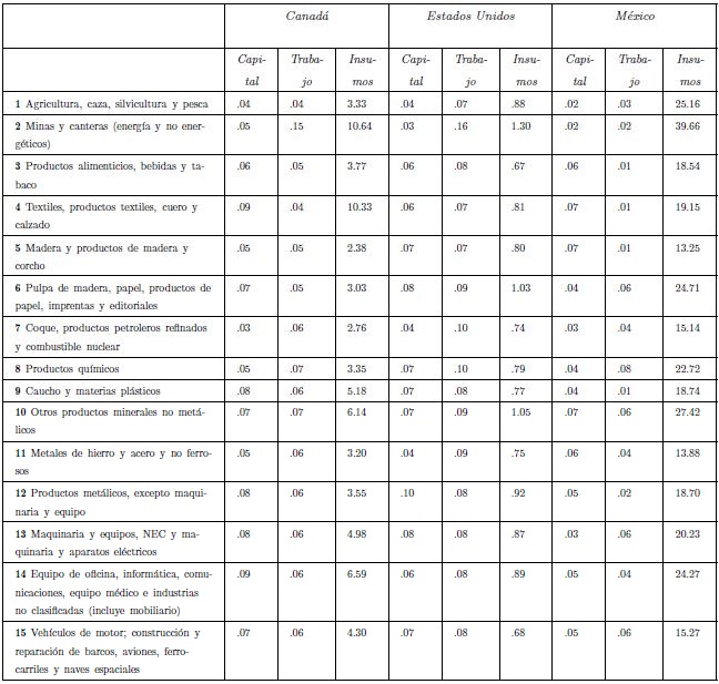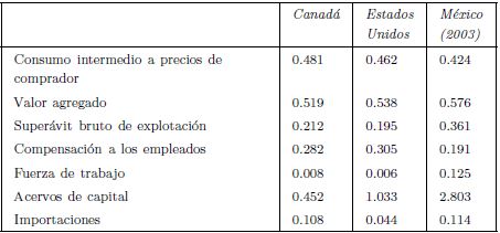 El Cuadro 6 muestra que Canadá es una economía relativamente más intensiva en el empleo de los insumos intermedios y, por lo tanto, genera menos valor agregado por unidad de producto: las ramas están mejor interrelacionadas respecto de sus socios del sur. México, por el contrario, es el país que genera mayor proporción de valor agregado y emplea menor cantidad de bienes producidos como insumos por unidad de producto, lo que implica relaciones intersectoriales relativamente menos complejas. Asimismo, la distribución del VA entre las remuneraciones al capital y al trabajo en Canadá y Estados Unidos son similares, pero en México la participación de los salarios es muy inferior a la registrada en las otras economías norteamericanas, mientras que la remuneración al capital es muy superior; lo que es consistente con la abundancia de fuerza de trabajo y escasez de capital, pero es contradictorio con el hecho de que esta economía emplea intensivamente el factor capital frente a Canadá. Enseguida, la economía de Estados Unidos es la más autárquica de las tres aquí consideradas y la de México es la más dependiente de las importaciones intermedias, lo cual es también un resultado de lo establecido antes, es una economía dedicada a ensamblar bienes en diversas etapas de elaboración.