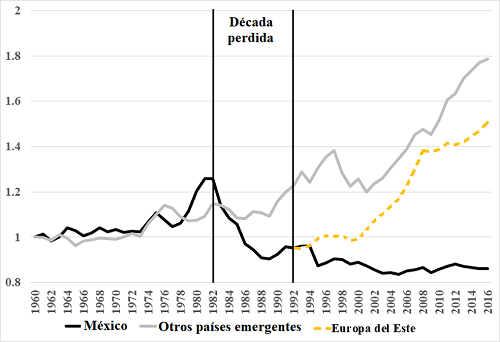 Durante el último cuarto de siglo el PIB per cápita de México se ha estancado respecto al de Estados Unidos de Norte América, mientras que el de países emergentes similares creció muy fuertemente: tomar como punto de comparación a los países de Europa del Este (Polonia, Hungría, Romania, Bulgaria y la Republica Eslovaca) o a un par de países de otras regiones (Malasia y Turquía) con características también muy similares a las de México, pero con un historial económico rastreable más antiguo (Gráfica 1) lleva a conclusiones similares.1 Sin embargo, durante 1960-1985, excepto por la burbuja petrolera de principios de los ochenta, México había seguido de muy cerca a este ultimo grupo de países. En todos los casos, los ingresos per cápita habían progresado levemente en relación con los de Estados Unidos. ¿Por qué entonces la diferencia entre el pasado más reciente y el pasado más lejano? ¿Por qué México dejó de converger?