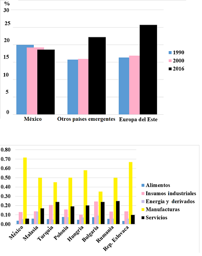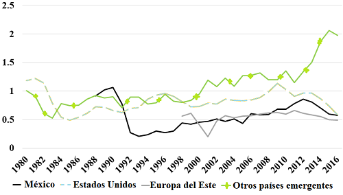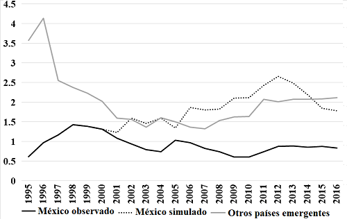 Por el contrario, si se compara a México con la media de los países de Europa del Este, los cuales experimentaron un proceso radical similar de integración comercial con Europa del Oeste a mediados de los años noventa, las respuestas siguieron trayectorias casi idénticas. Lo anterior sugiere, por lo tanto, que el lento crecimiento de México en los últimos veinte años ha sido, en buena medida, una consecuencia predecible (y probablemente inevitable) de la apertura comercial.15 Frente a una apertura comercial muy rápida y completa, construir una capacidad exportadora (que permita elevar la respuesta doméstica por la vía de su numerador) toma más tiempo que sustituir bienes locales por importados (lo que reduce la respuesta doméstica a través de su denominador). Sin embargo, el hecho de que en todos los casos los desplomes fueran seguidos por recuperaciones lentas pero continuas es una señal positiva para el futuro.