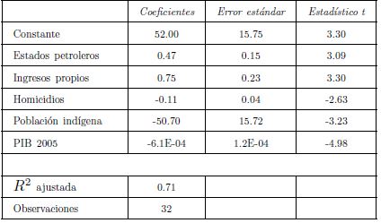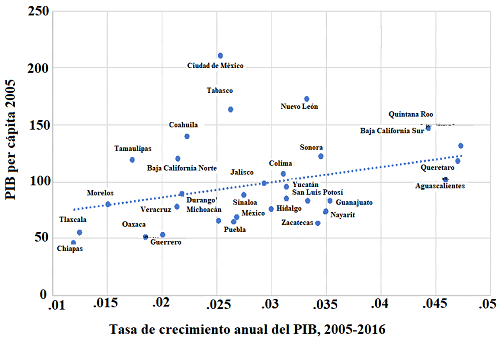 Las diferencias de crecimiento del PIB por estado están asociadas a disparidades regionales importantes, tanto en relación con factores estructurales (como el ingreso per cápita inicial o el porcentaje de población indígena), como con la calidad del entorno institucional (número de homicidios por habitante) y de la gobernanza del estado (proporción de ingresos propios en el total de ingresos de los gobiernos locales). Una regresión simple con estos factores de control (véase Cuadro 4 del Apéndice estadístico) confirma que los estados que crecieron más rápidamente fueron los que partieron de un PIB per cápita más alto, contaron con menos población indígena, fueron expuestos a menos violencia y tuvieron mejores gobiernos.
