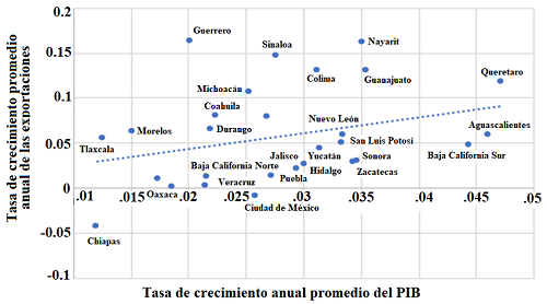 Es probable, no obstante, que la lenta y limitada respuesta de la economía mexicana a la tracción ejercida por sus importaciones también refleje la coexistencia de regiones o sectores rezagados que crecen a tasas muy inferiores al resto de la economía. Como lo muestra la Gráfica 11, existen diferencias muy grandes de ingreso per cápita entre los estados más pobres de México, esencialmente los del suroeste de la republica (Morelos, Guerrero, Chiapas, Oaxaca) y los más ricos. Al mismo tiempo, la brecha entre ricos y pobres esta ampliándose cada vez más ya que los estados más pobres tienden a crecer más lentamente. A su vez, los estados que más han crecido son aquellos en donde las exportaciones también han crecido más rápidamente, lo que confirma, esta vez a nivel de gobiernos sub-nacionales, la relación inequívoca entre crecimiento y comercio exterior (Gráfica 12).16 El rezago económico de estas regiones afecta el crecimiento del país en su conjunto y reduce su capacidad de respuesta a las exportaciones. En efecto, si para calcular el coeficiente de respuesta se eliminaran del PIB los estados del suroeste desaparecería el rezago en este coeficiente (subiría de 0.8 a 1.05).