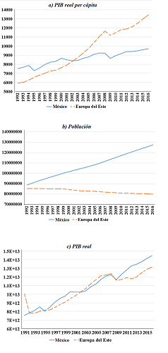 Dicha diferencia refleja esencialmente un diferencial demográfico. Mientras que el TLC dio lugar a un efecto tracción similar en ambas regiones el impacto per cápita se diluyó en México por causa del mayor aumento de su población, aumento que contrasta abruptamente con la caída de la población en Europa del Este debida, en parte, a la migración masiva hacia Europa del Oeste (Gráfica 13b). En términos de crecimiento bruto del PIB, el TLC fue tan bueno para México como la integración comercial europea lo fue para Europa del Este (Gráfica 13c). No obstante, en el caso de México este crecimiento fue insuficiente para proveer el empleo necesario para una fuerza laboral en mucho más rápido crecimiento.