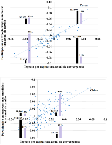 En la gran mayoría de los países (alrededor de 70%) los cambios en convergencia (adelantos o retrasos) se vieron acompañados por cambios paralelos (incrementos o decrementos) en el grado de participación de sus exportaciones en el comercio mundial. Son pocos los países que hayan convergido sin que sus exportaciones hayan ganado terreno o, a la inversa, que hayan progresado en el comercio mundial sin que esto les haya favorecido para converger.3 Más aún, en aquellos países que crecieron hacia adentro pero no hacia fuera, las ganancias en convergencia fueron muy limitadas.