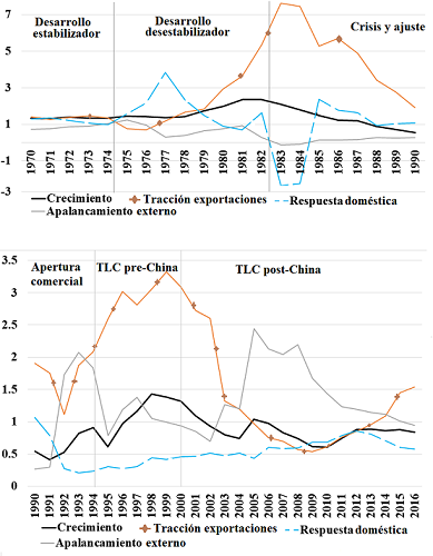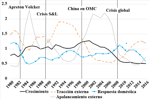 Se aprecia visualmente que la correlación más importante entre el crecimiento y sus componentes es con la tracción de exportaciones. En efecto, una descomposición de varianza para México a lo largo del periodo 1990-2016 indica que más de 80% de las variaciones de crecimiento durante ese periodo se explica por las exportaciones; en tanto que 50% adicional por cambios en el apalancamiento. La clara correlación negativa entre apalancamiento y tracción de exportaciones confirma la naturaleza contracíclica de este término: un aumento en apalancamiento permitió estabilizar el crecimiento cuando cayó la tracción exportadora. Finalmente, la descomposición de varianza también indica que la respuesta doméstica explicó un 30% negativo del crecimiento. Lo anterior resalta claramente el papel de freno al crecimiento que ha jugado este último término en México durante los pasados veinte años.